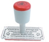Traditional rubber stamp mounted on clear acrylic with plastic or wooden handle for use with an ink pad.